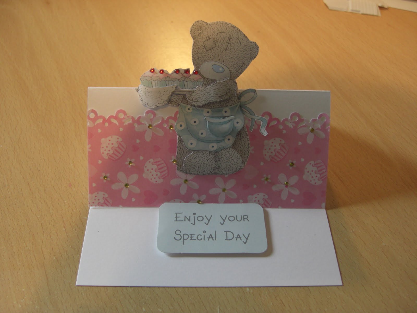 I've stuck this baking teddy onto an easle style card and finished off with red diamantes for the cherries on the cupcakes. The backing paper comes from buzzcraft, which is a bargain at a quid for a pack of 10 sheets. I've stuck yellow diamantes onto the flower centres to add even more sparkle, although you can't really tell from the photo.